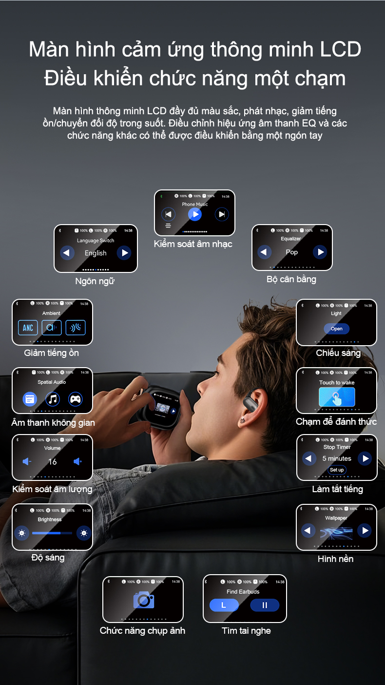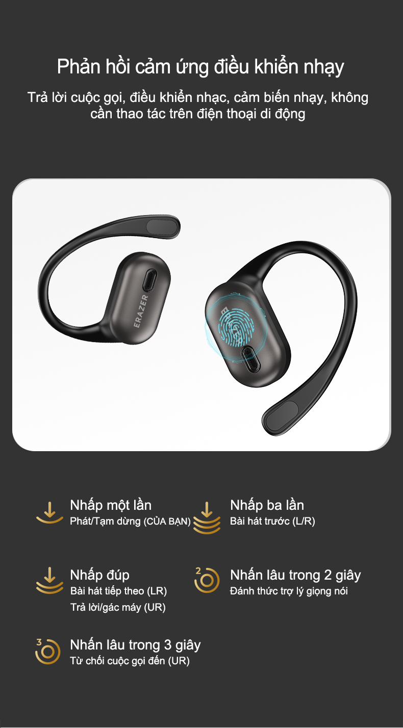 Chế độ nhạc: Nhấn và giữ lại tai nghe bên phải trong 2 giây, bạn sẽ nghe thấy hai âm thanh nhắc nhở.