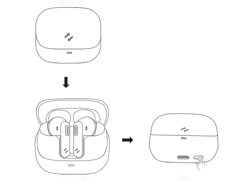 2. Mở nắp hộp sạc, nhấn nút reset trên hộp sạc và giữ trong 5 giây cho đến khi đèn báo trên hộp sạc nhấp nháy màu trắng. Reset đã hoàn tất.