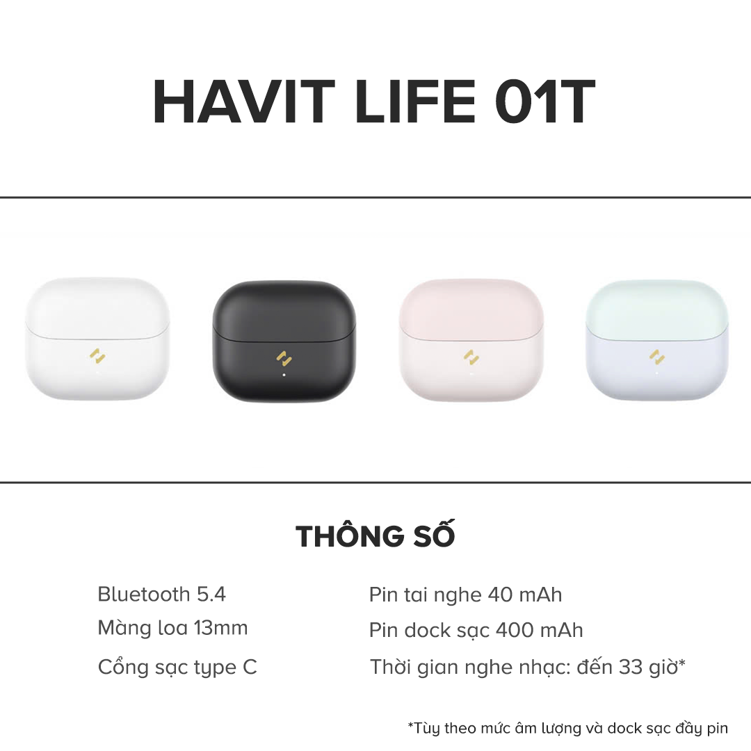Tai Nghe True Wireless HAVIT LIFE 01T, Bluetooth 5, AI Khử Ồn, Nghe Đến 33H - Hàng Chính Hãng