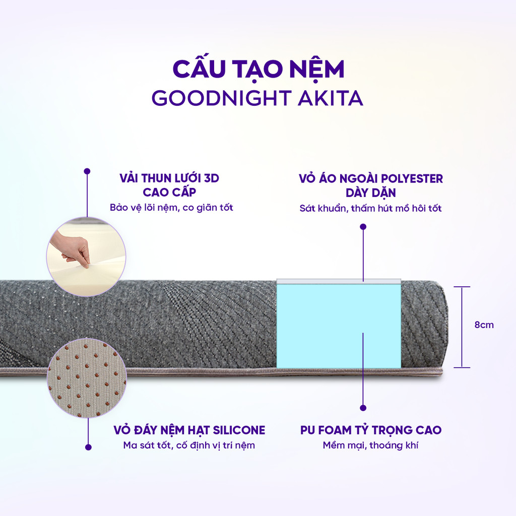 Goodnight Akita là dòng nệm foam Goodnight cải thiện hiệu quả tình trạng đau lưng, nhức mỏi nhờ sở hữu độ đàn hồi cao từ PU Foam. Phần chất liệu của nệm Akita giúp nâng đỡ trọn vẹn đường cong cơ thể, bảo vệ cột sống cân bằng, để cơ thể cảm nhận được sự mềm mại mà không lún trũng cho giấc ngủ thoải mái hàng đêm.