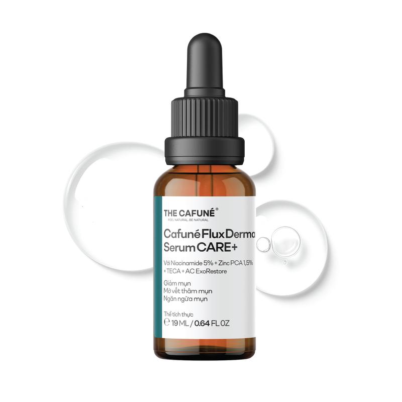 Serum dành cho da mụn thâm lỗ chân lông to Cafuné Flux Derma Serum kết hợp Niacinamide 5% & Zinc PCA 1,5% hỗ trợ giảm mụn, mờ thâm và giúp kiểm soát bã nhờn. TECA làm dịu và phục hồi da sau mụn, trong khi AC ExoRestore hỗ trợ củng cố hàng rào bảo vệ, góp phần hạn chế mụn quay trở lại. Yogurtene Balance (pre/probiotic complex) giúp cân bằng hệ vi sinh và củng cố hàng rào da mụn nhạy cảm. Kết cấu thấm nhanh, không gây khô căng.