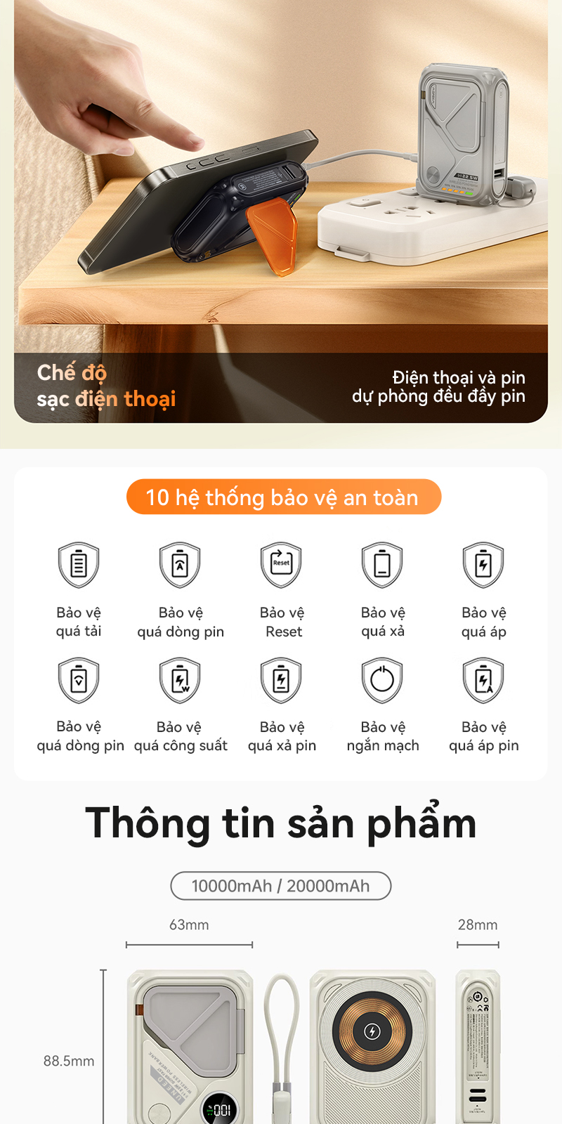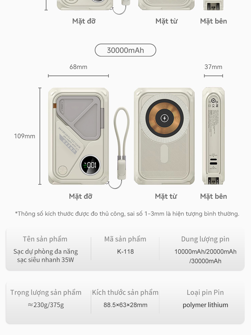 · Kích thước: 8.85×6.30×2.80cm (20000mAh)/10.30×6.80×3.70cm (30000mAh)