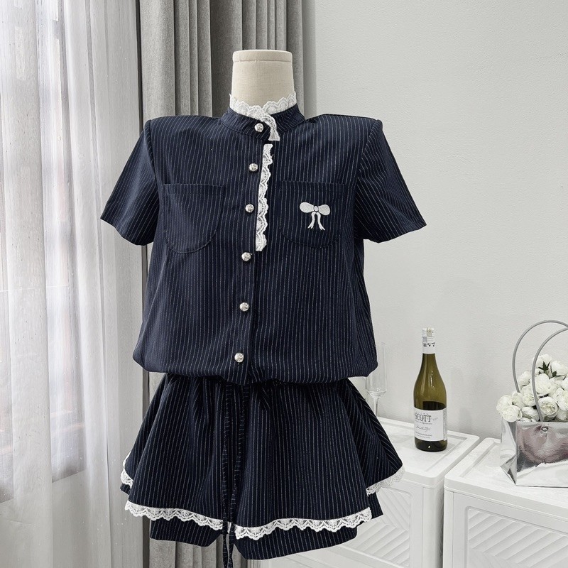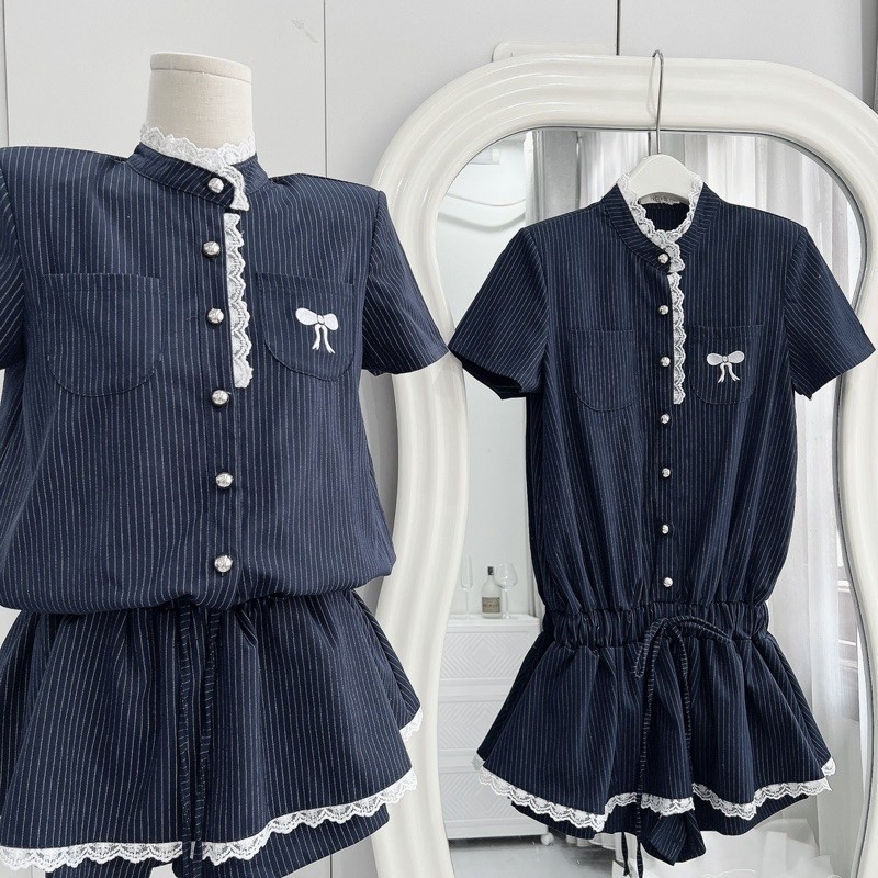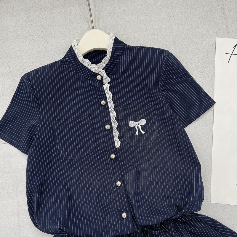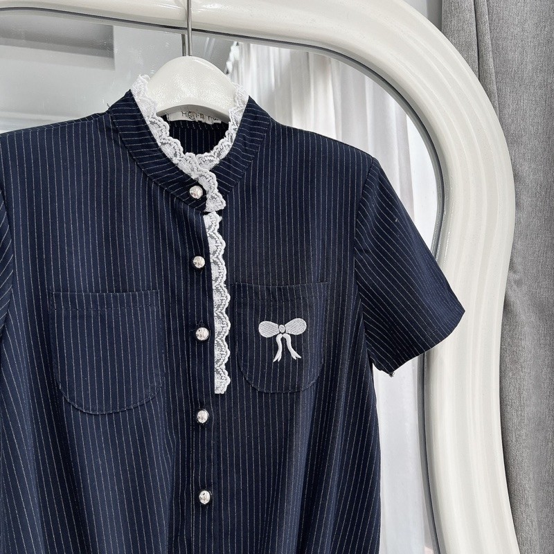 [V1.732] Jum Váy Kẻ Cổ Tàu Phối Viền Ren Thêu Nơ Túi Ngực Chun Eo Siêu Xinh (có độn vai)