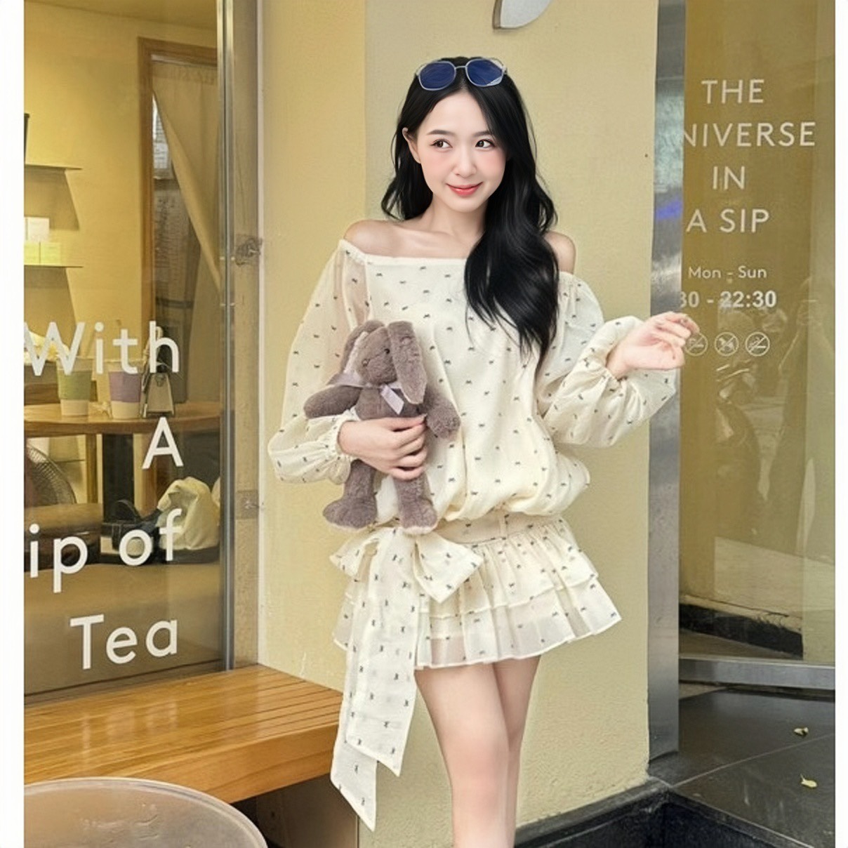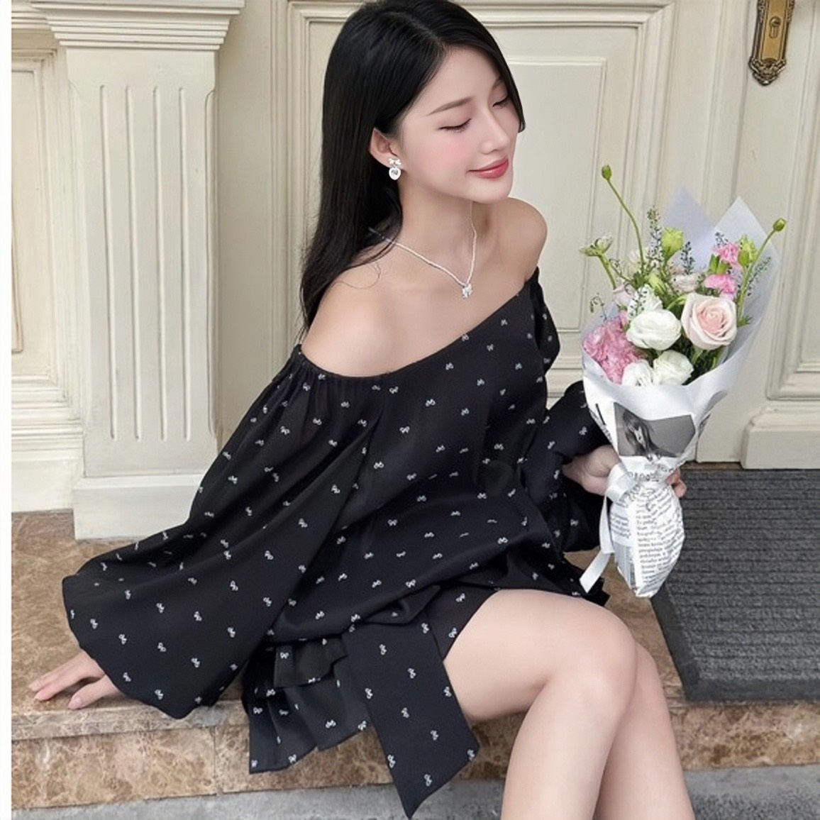 VÁY TRỄ VAI DÁNG BÍ DÀI TAY BỒNG BO CHUN HÔNG ĐÍNH NƠ SIÊU XINH V14