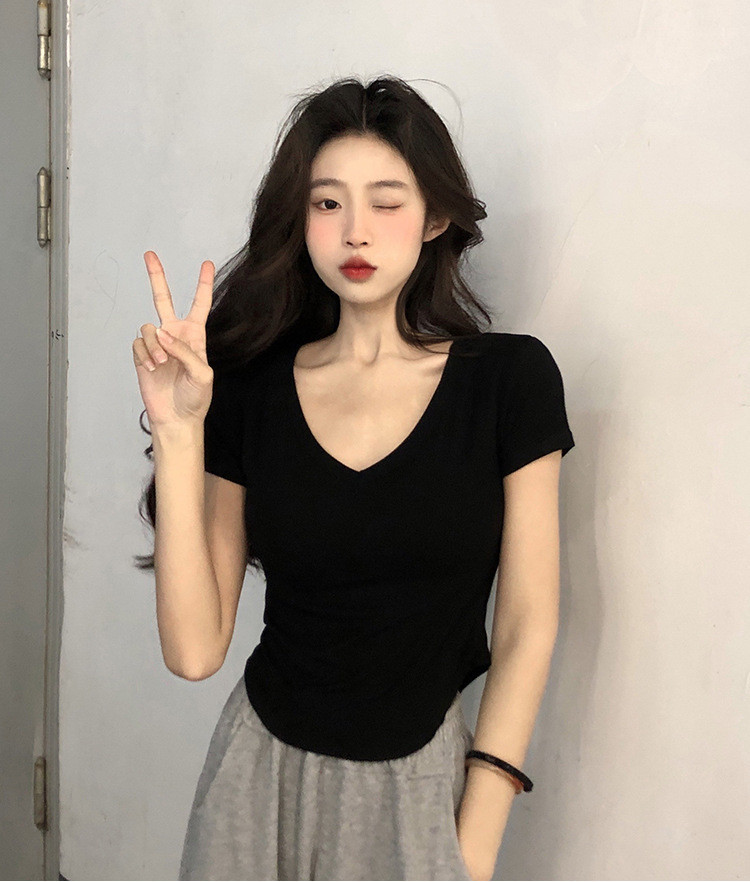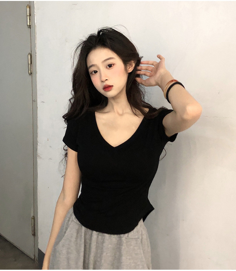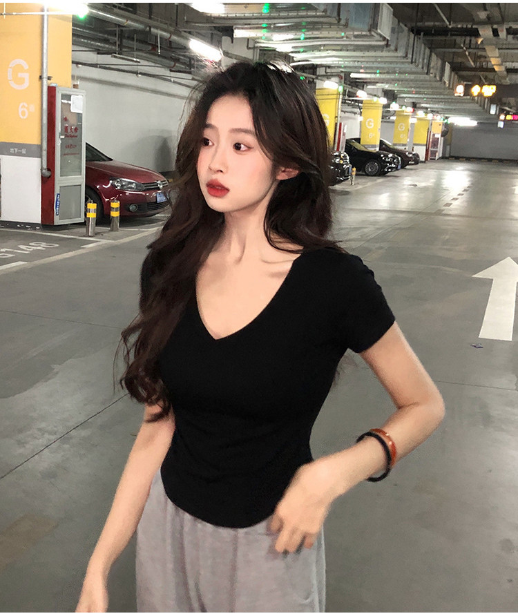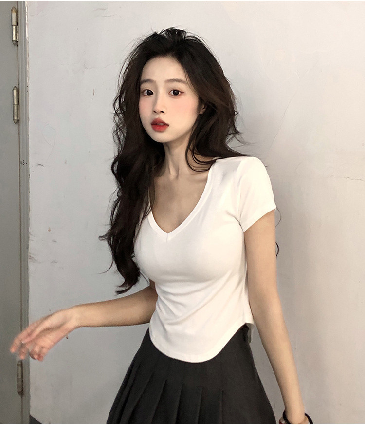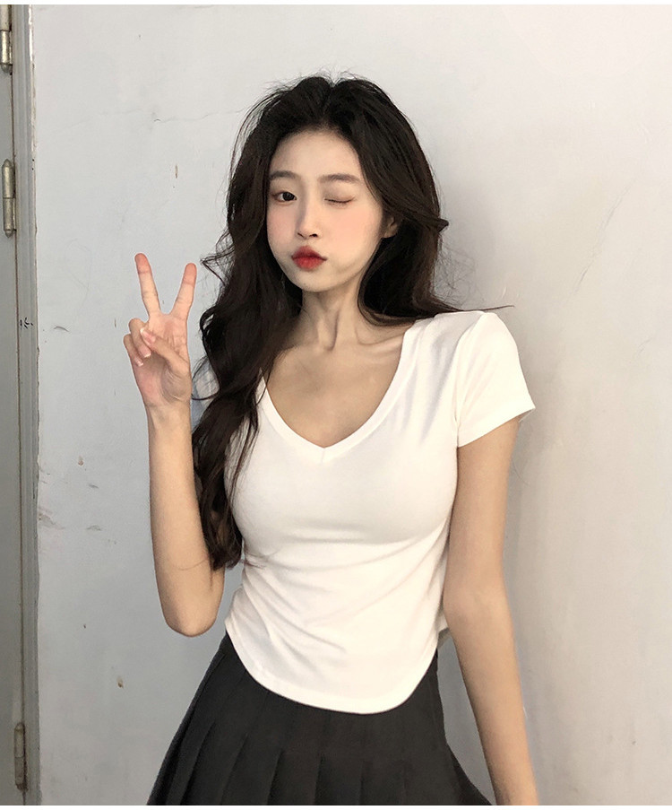 【WANG JIAO ZHAN】Áo croptop thun tay ngắn cổ chữ V màu trơn thời trang cho nữ【6757】