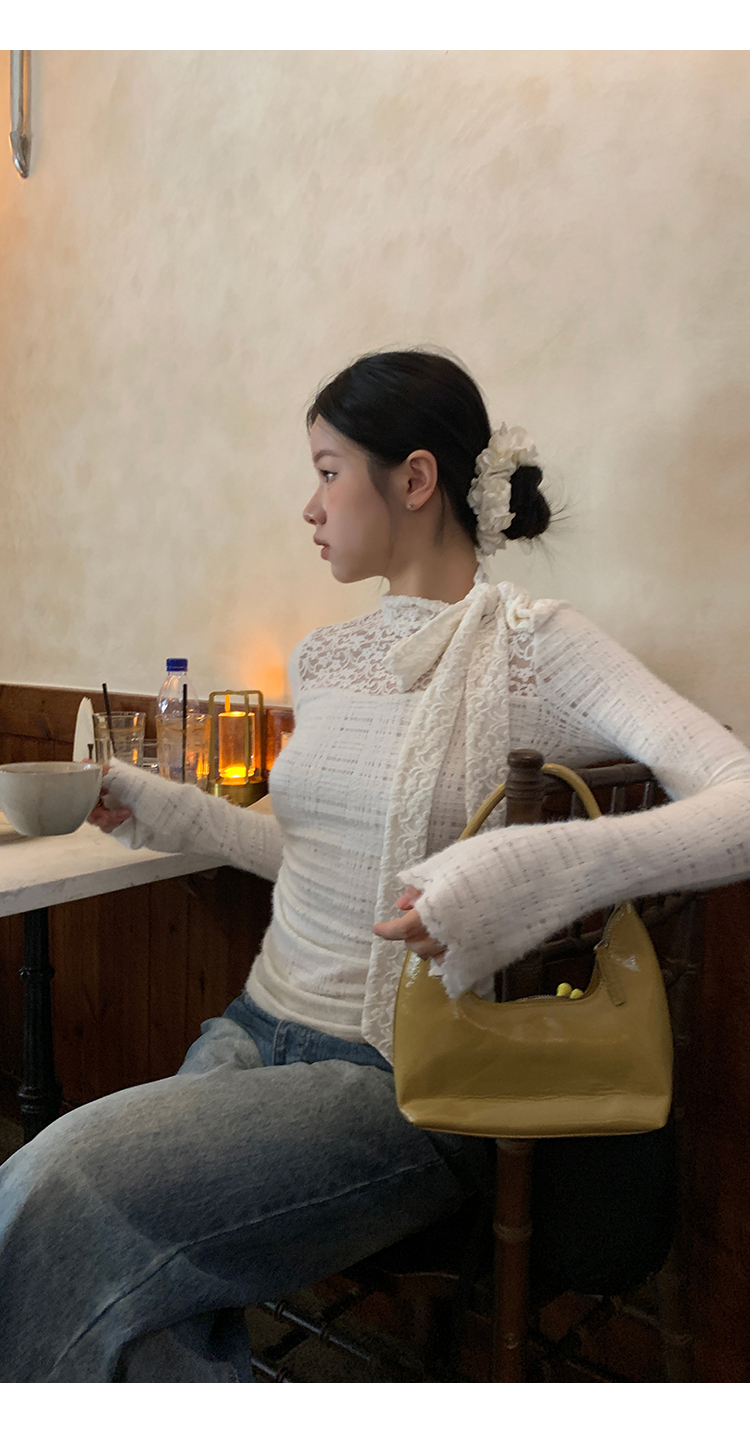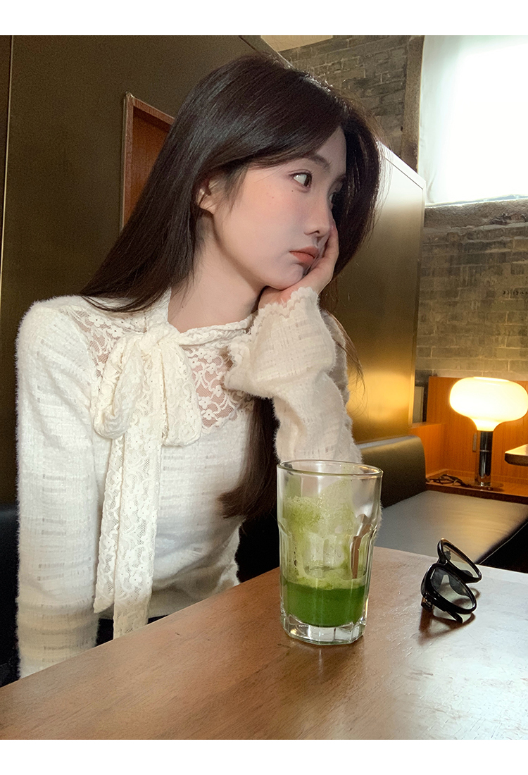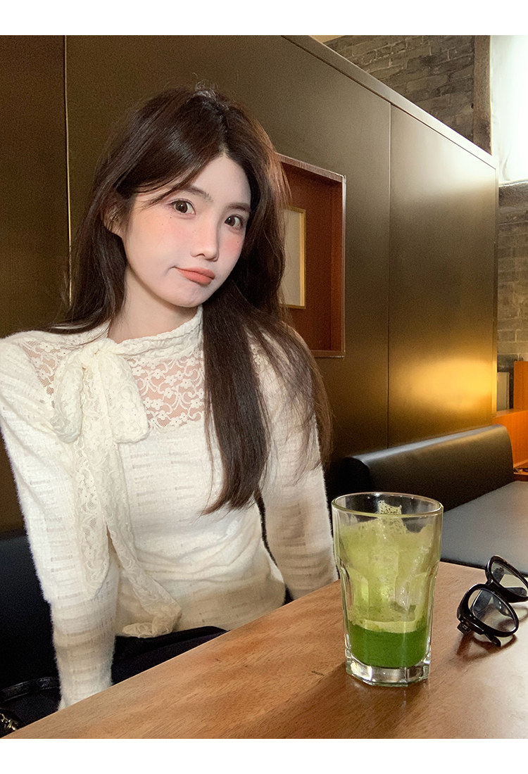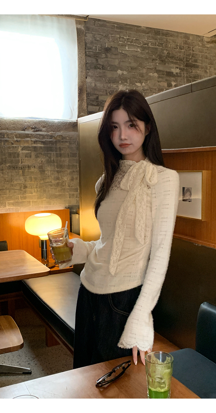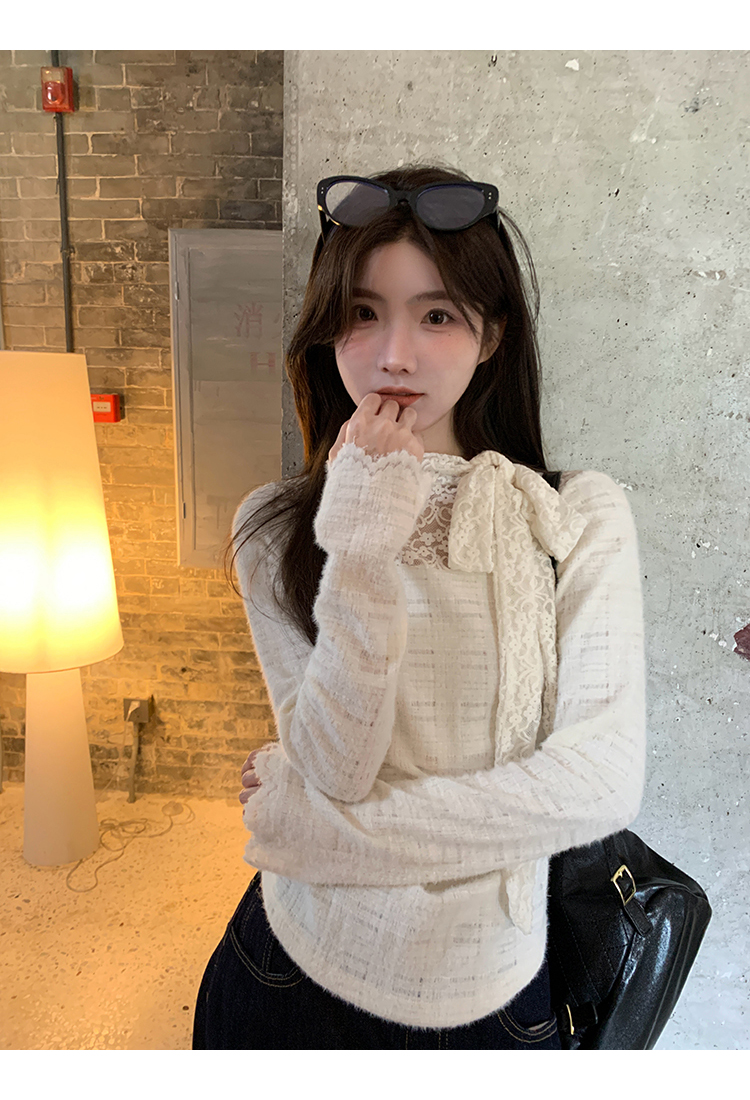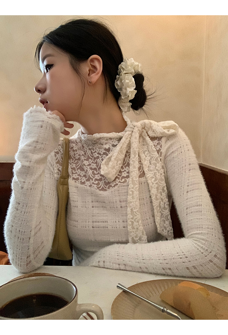 【W】Áo Thun Dài Tay Nữ Ren Bow tie straps Ôm body Thời trang Top khí chất