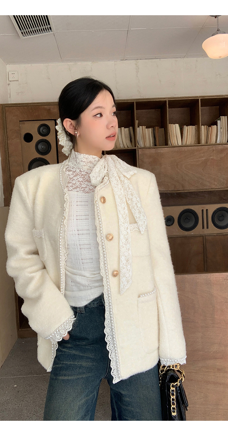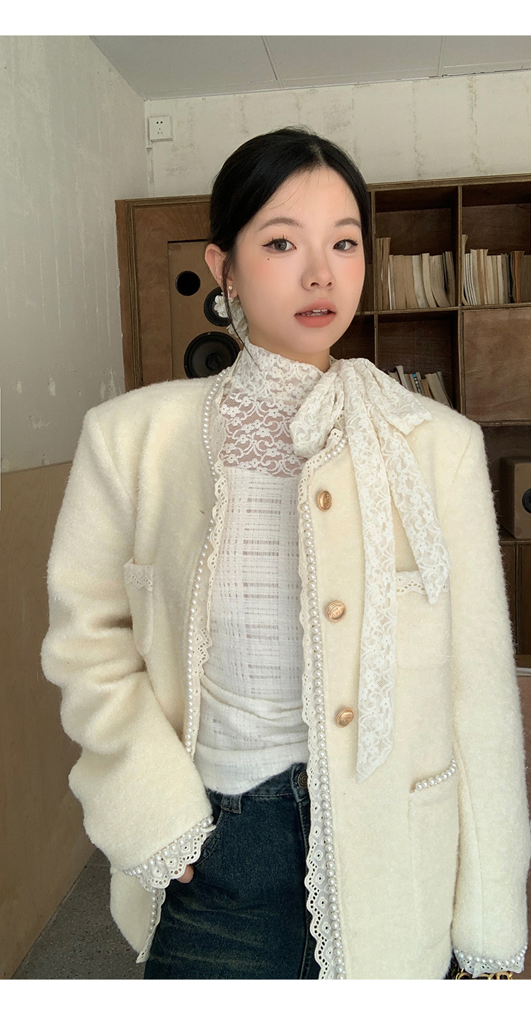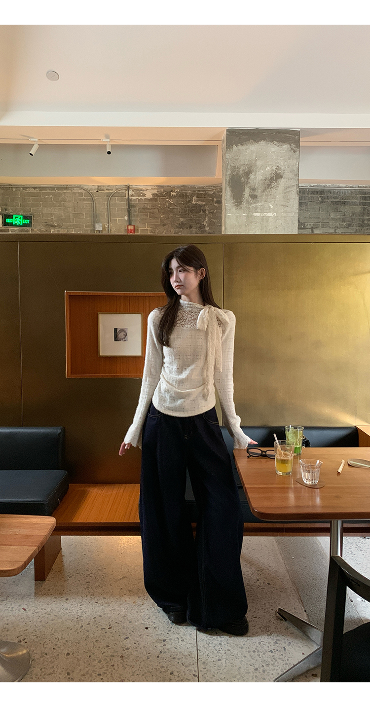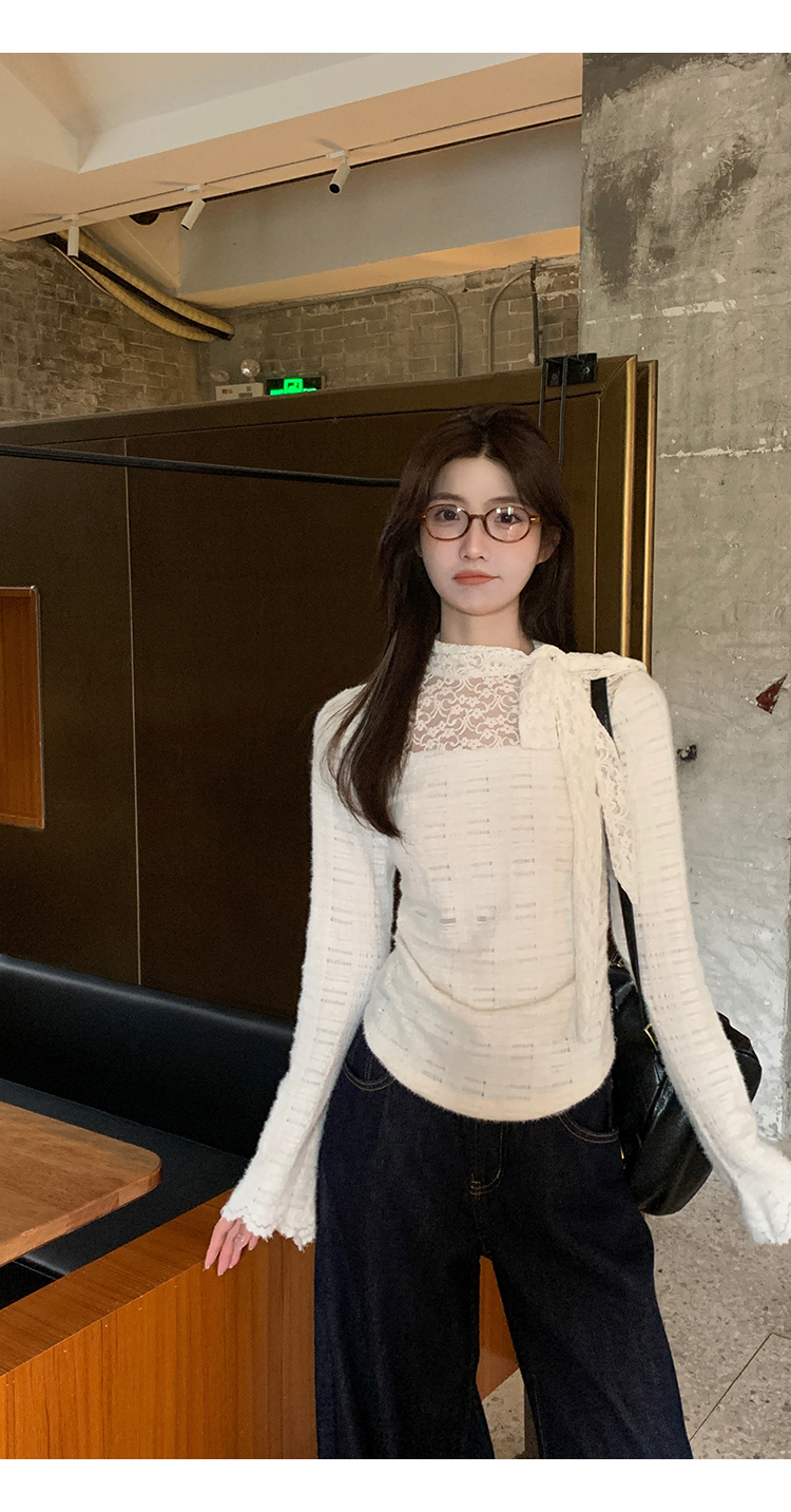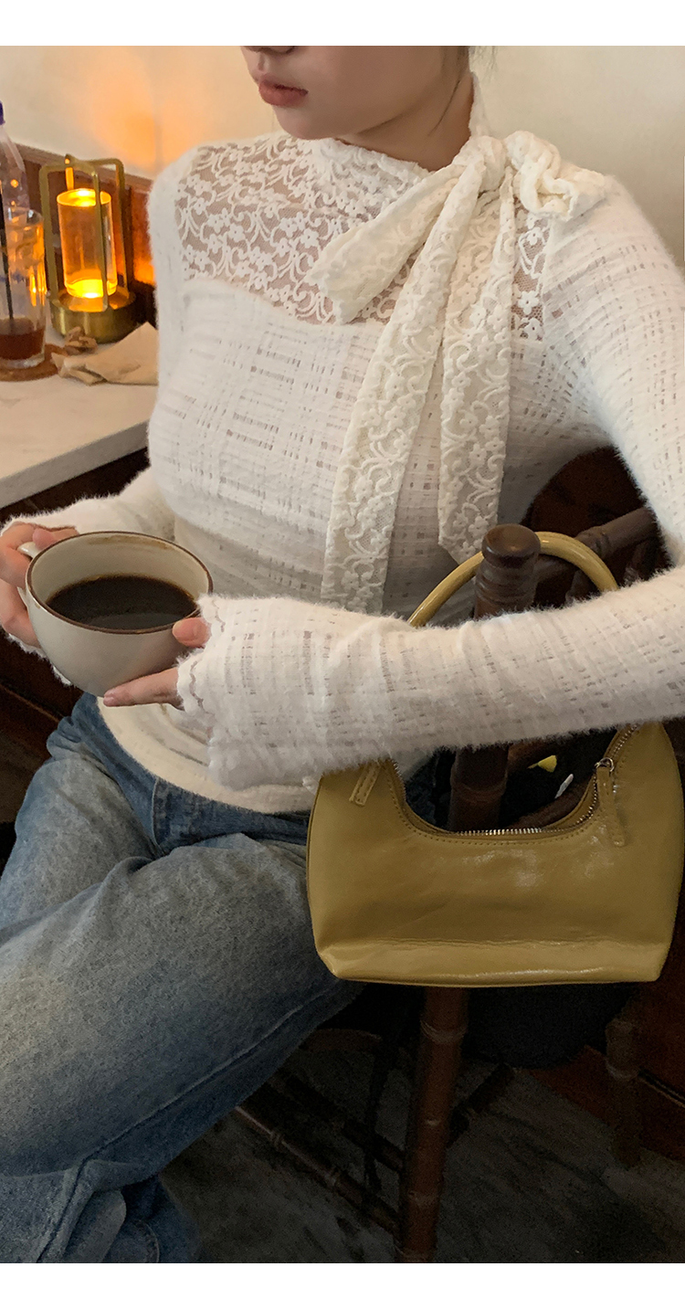 【W】Áo Thun Dài Tay Nữ Ren Bow tie straps Ôm body Thời trang Top khí chất