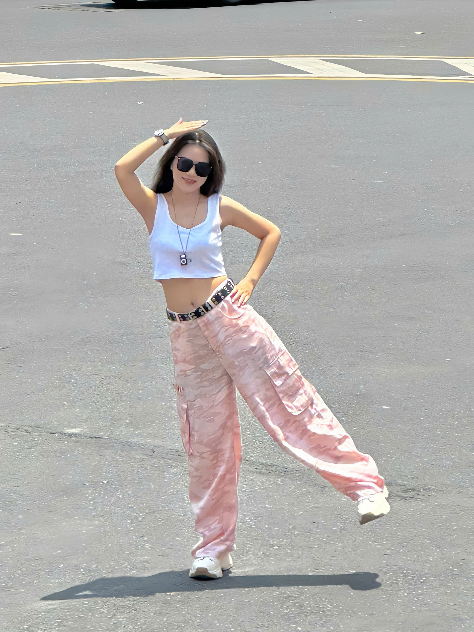 Gợi ý phối đồ:Áo thun trắng + sneaker cổ caoÁo croptop + túi đeo chéo + mũ bucket