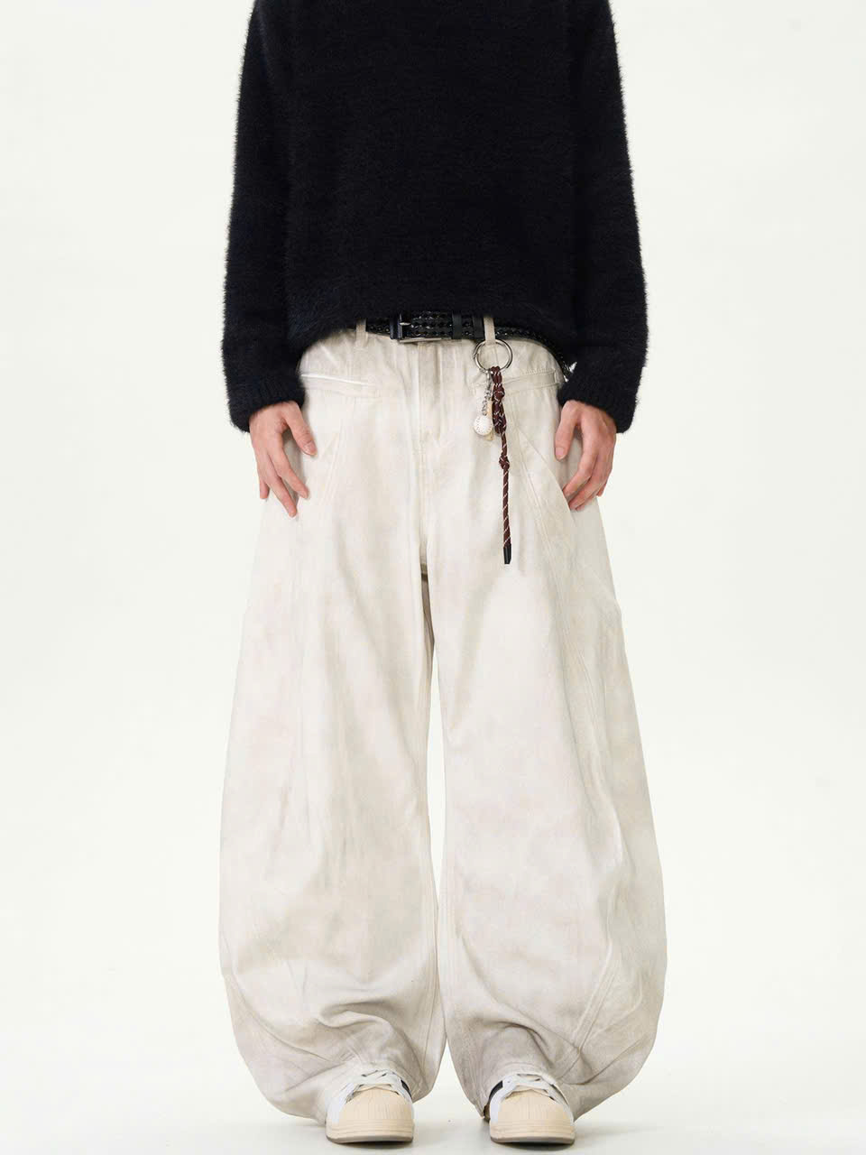 Màu sắc: Tông trắng/be nhạt với hiệu ứng loang màu xám hoặc ngả vàng ở phần ống, tạo phong cách grunge hoặc vintage wash.
